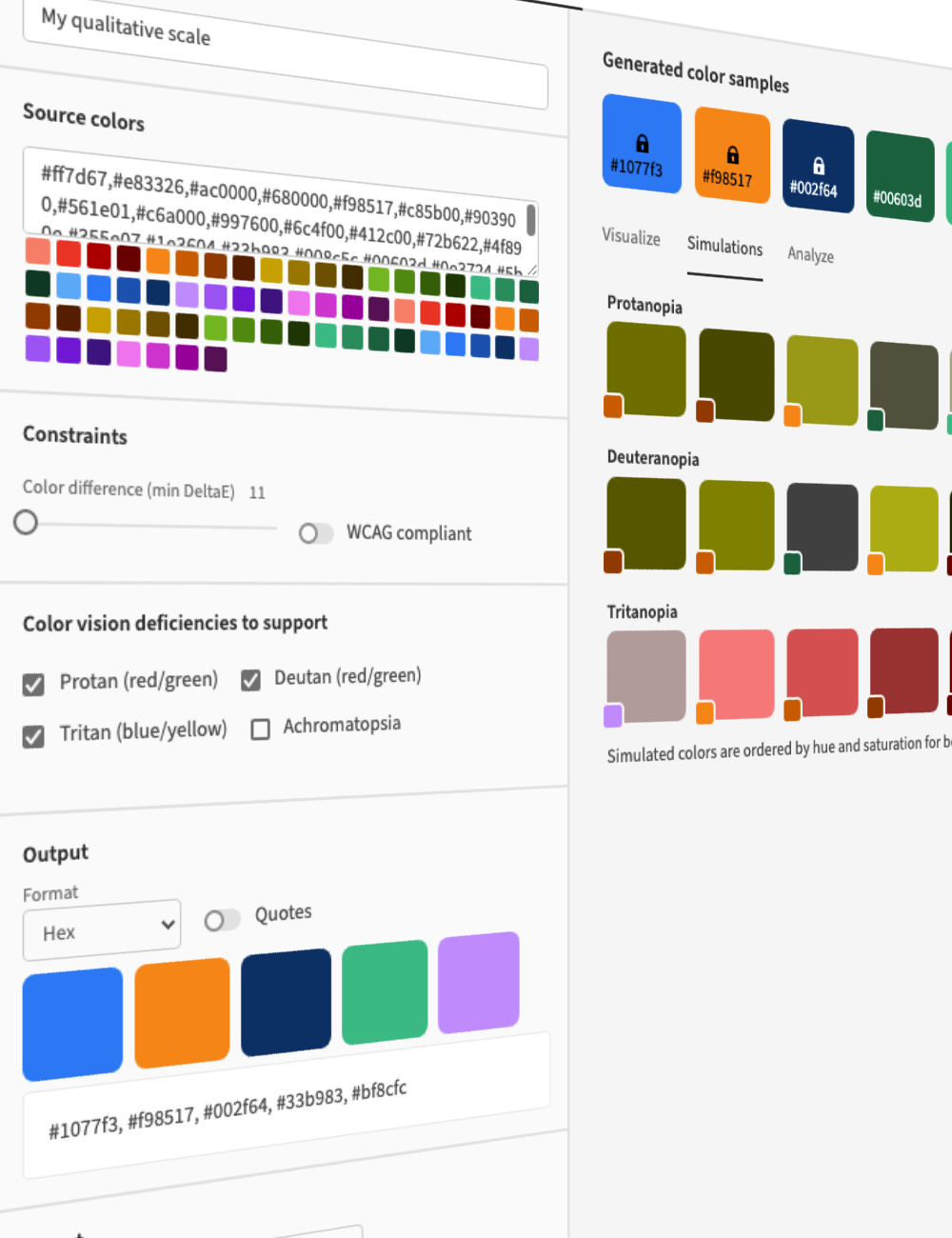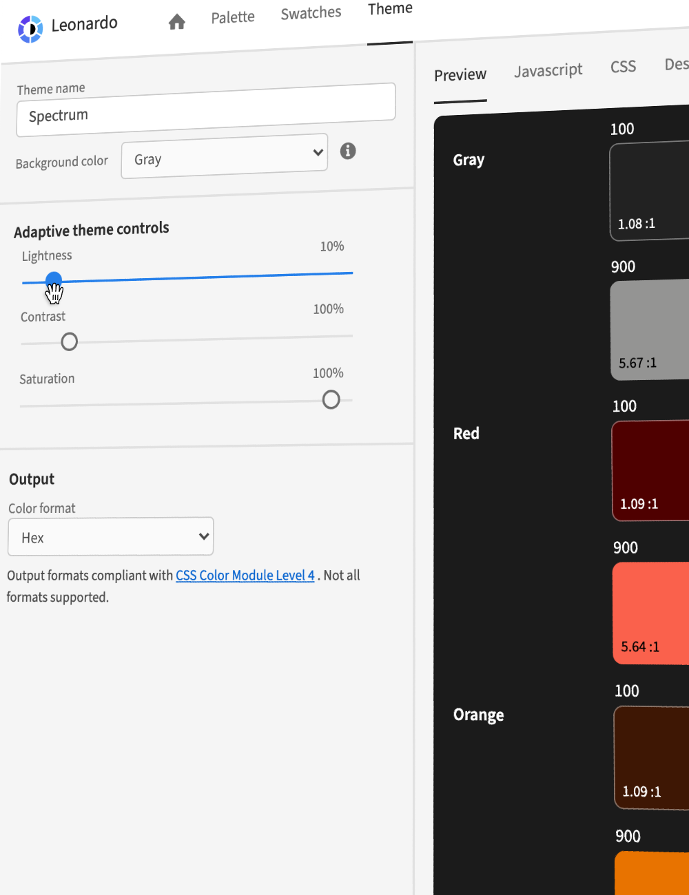 Available output formats conform to the W3C CSS Color Module Level 4 spec for the supported options, as listed below: