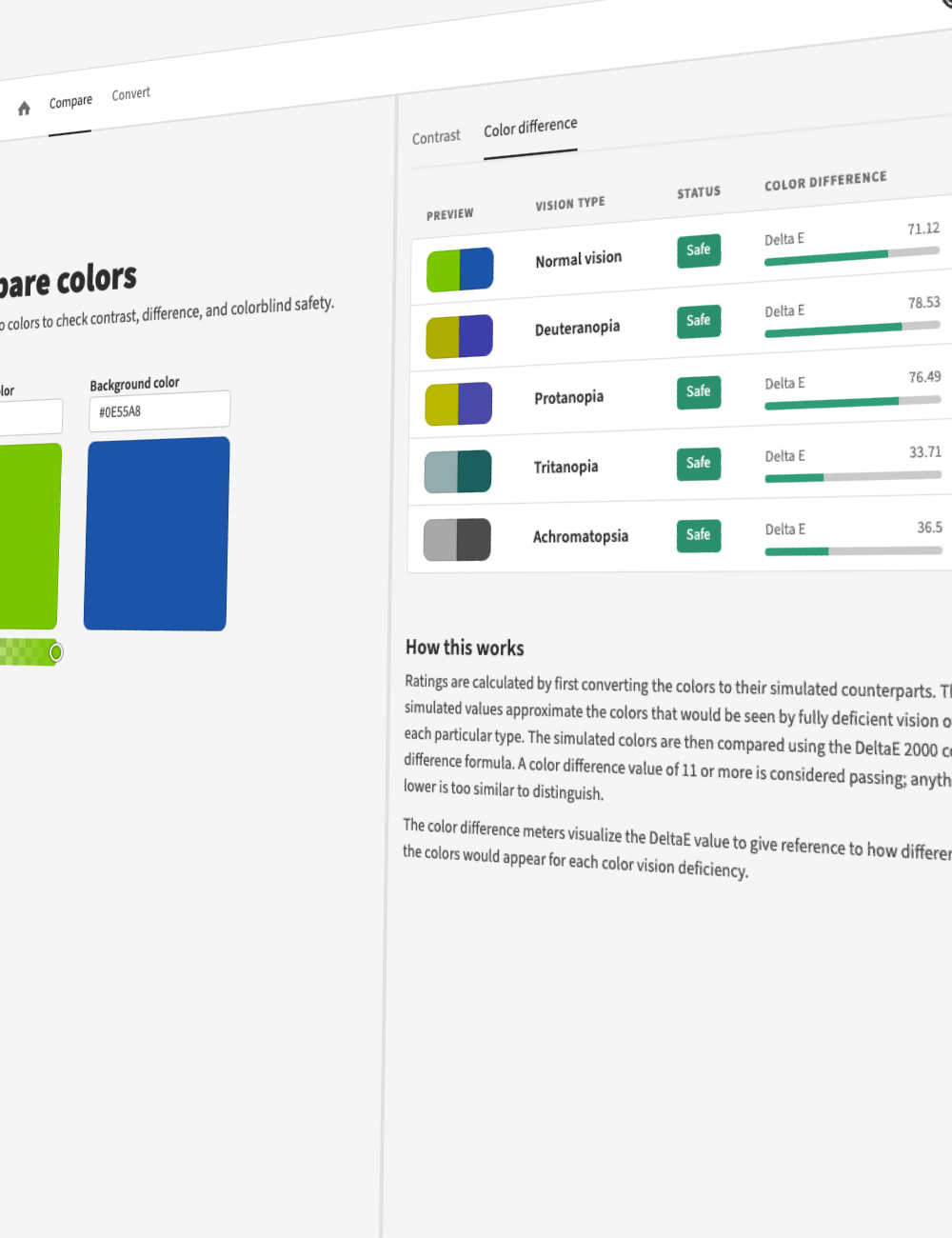 You may notice the tool takes an input (target ratio) but most often outputs a contrast ratio slightly higher. This has to do with the available colors in the RGB color space, and the math associated with calculating these ratios.